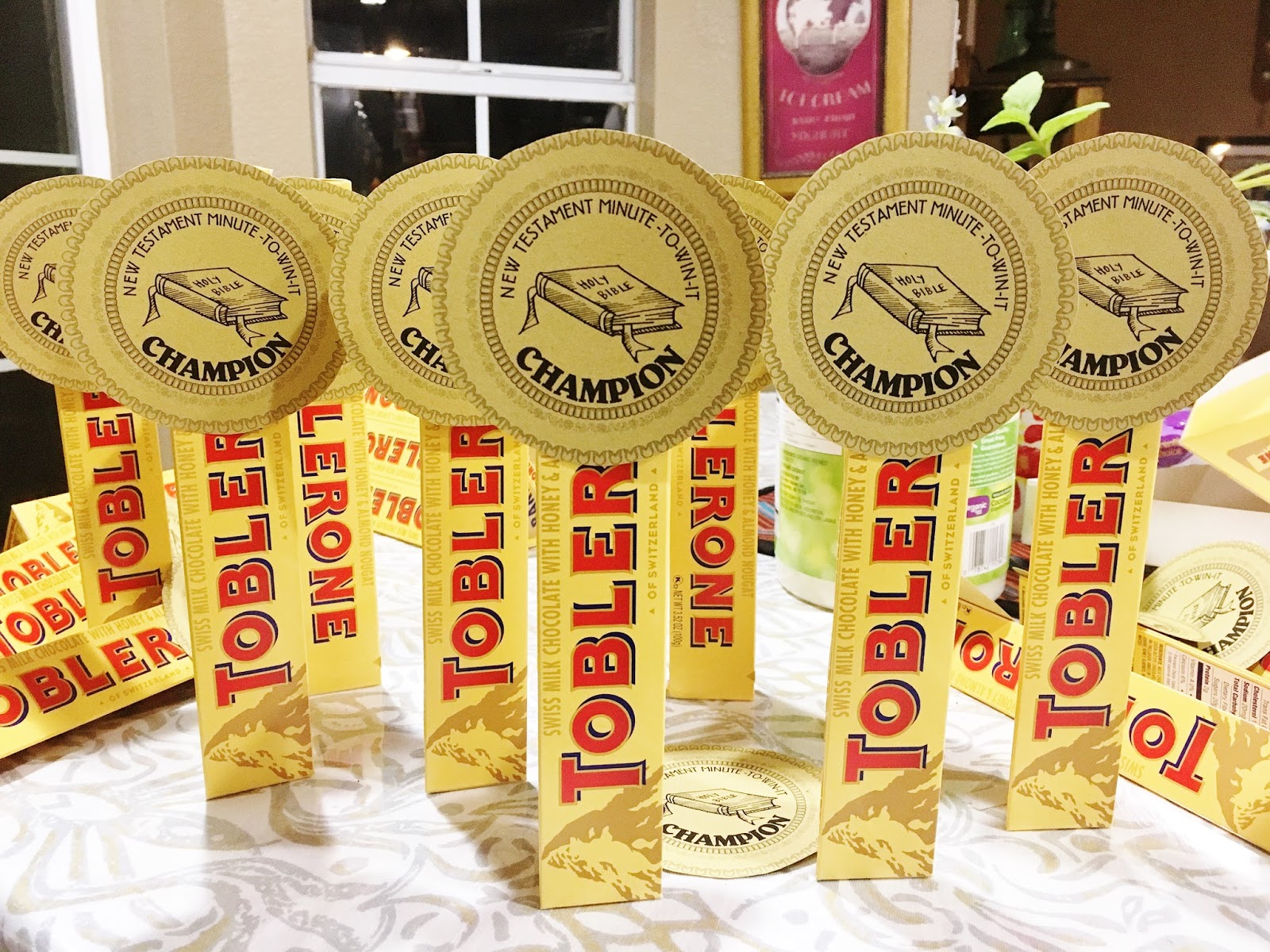 We made trophies from bags of Lindor Truffles. I printed out the medallions and glued one on to each bag to give to the winning team. Here is a printout for the medallions. I printed it out on gold cardstock.